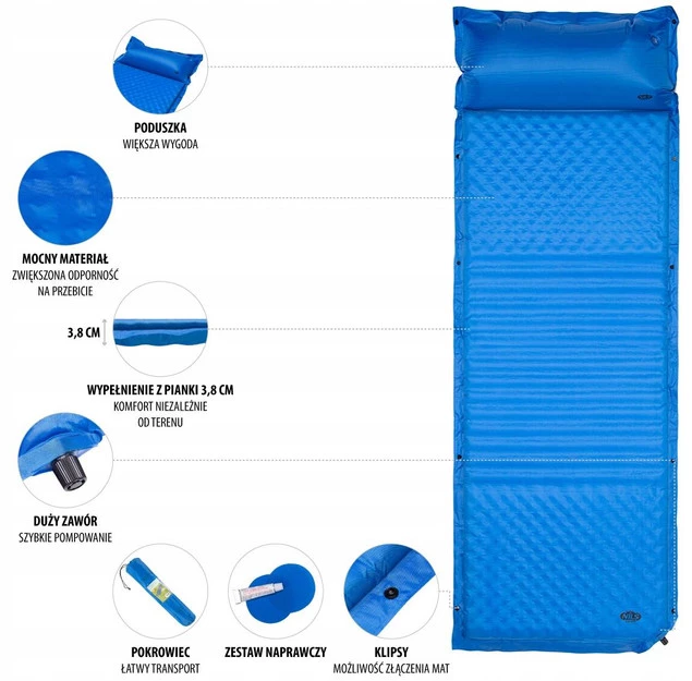 Mata samopompująca z poduszką to świetne rozwiązanie dla każdego miłośnika spędzania czasu podczas campingu, pod namiotem czy na plaży!