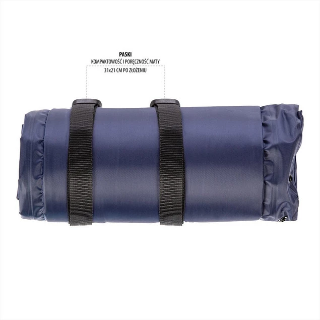 Mata po złożeniu, zajmuje bardzo mało miejsca, a sposób składania jest bardzo prosty. Wystarczy odkręcić zawór i zrolować matę, zaczynając od góry. Nie musimy obawiać się, że sama się rozwinie, ponieważ posiada dwa paski z zatrzaskami. Po zrolowaniu, zapinamy je i mata zabezpieczona. Dodatkowo, w zestawie znajduje się poręczny pokrowiec, do którego zapakujemy naszą matę. To znacznie ułatwi transport i dodatkowo zabezpieczy matę, przed uszkodzeniem. Całość, w połączeniu z tym, że waga maty to zaledwie 1 kg powoduje, że bez problemu możemy ją mieć ze sobą, przy okazji każdej wycieczki.