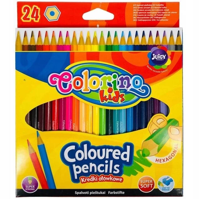 Kredki ołówkowe Colorino Kids wyróżnia niezwykle miękki i jednocześnie bardzo wytrzymały rysik oraz doskonały wybór soczystych, intensywnych kolorów. Heksagonalny kształt zapewnia wygodę oraz gwarantuje, że kredka nie stoczy się ze stołu.