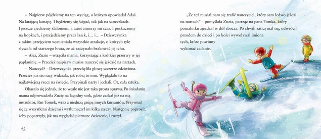 Zuzia stała z noskiem przyklejonym do okna przytulnej góralskiej chaty i w jej główce aż roiło się od pomysłów na pyszną zabawę! Na dodatek czekały na nią... narty, kochani, narty! Oczami wyobraźni już sięgała po Puchar Debiutanta, jednak okazało się, że małym narciarzom lubią towarzyszyć przeróżne koziołki, wywrotki i plątaninki. Zaś w mlecznej mgle i kopiastych zaspach łatwo się zgubić, szczególnie gdy stoją za tym jakieś czary...