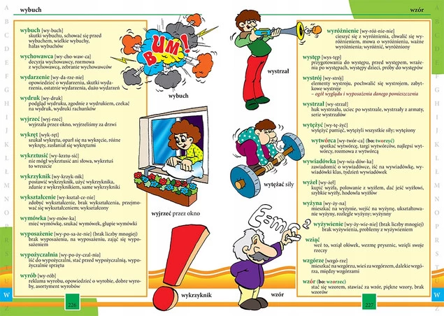 Ilustrowany słownik ortograficzny jako jedyny na rynku posiada hasła z podziałem na sylaby. Słówka opatrzone zostały odmianą całych wyrazów, a najtrudniejsze z nich wyjaśniono w przystępny dla dziecka sposób. Słowniczki są polecane przez nauczycieli i metodyków pracujących z dziećmi.