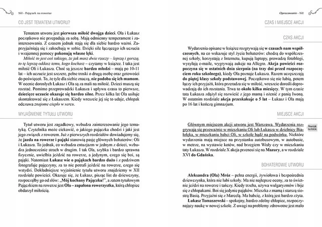 Wydanie Pajączka na rowerze kompletne bez skrótów i cięć w treści. W tym wydaniu znajdziesz odpowiedzi na pytania z podręcznika - "pewniak na teście", czyli wskazanie zagadnień, które zwykle pojawiają się w pytaniach z danej lektury we wszelkich testach sprawdzających wiedzę, a także w podręcznikach i na klasówkach. Książka zawiera pełen tekst lektury. Na końcu książki zamieszczono opracowanie, w którym znajduje się bardzo szczegółowe streszczenie oraz drugie skrócone, ułatwiające szybkie przygotowanie się przed lekcją. Opracowanie zawiera ponadto plan wydarzeń, wnikliwie wyjaśnioną problematykę oraz szerokie charakterystyki bohaterów.