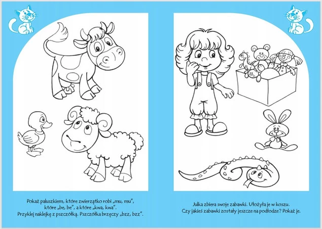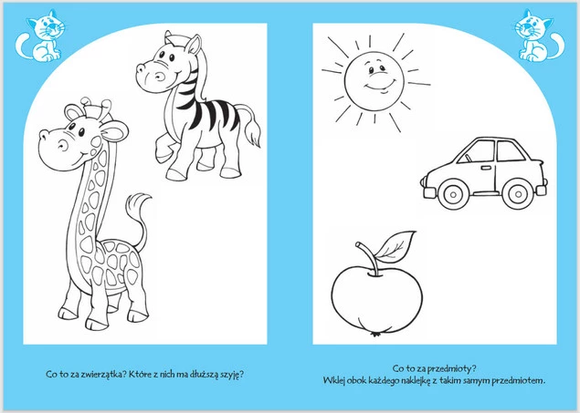 Możliwość kolorowania, uzupełniania i wklejania naklejek daje dodatkową satysfakcję i radość z samodzielnego wykonania ćwiczeń.