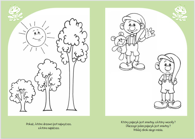 Możliwość kolorowania, uzupełniania i wklejania naklejek daje dodatkową satysfakcję i radość z samodzielnego wykonania ćwiczeń.