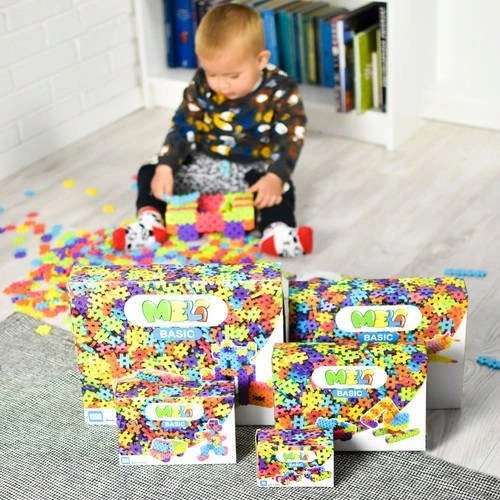 - Klocki konstrukcyjne Meli Basic 600 elementów dla dzieci 3+. Kolorowe wafle łączą się jak puzzle, pozwalając tworzyć przestrzenne modele, rozwijać kreatywność, liczenie, rozpoznawanie kolorów i małą motorykę.
