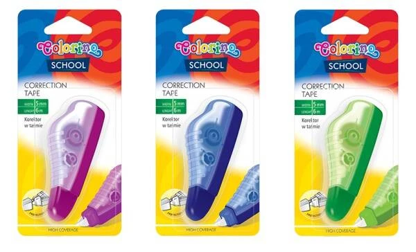 Korektor w taśmie jest niezbędnym akcesorium zarówno w piórniku szkolnym, jak i w biurze. Dzięki korektorowi w taśmie notatki pisane długopisem, cienkopisem lub żelopisem mogą zostać skorygowane bez zbędnych przekreśleń. Przy użyciu precyzyjnej końcówce, można korygować nawet pojedyncze litery lub znaki. Korektor ma formę wygodnej taśmy, poprawek można dokonywać natychmiast po jego użyciu.