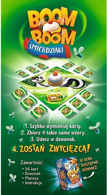 W Boom Boom gracze starają się uzbierać zestawy tych samych Śmierdziaków. Gracze wymieniają jednocześnie swoje karty z kartami na planszy. Po złapaniu 4 takich samych Śmierdziaków gracz uderza w dzwonek i sygnalizuje zebranie gotowego stosu. Gracze mogą polować na karty tego samego typu, dzięki czemu rozgrywka jest jeszcze bardziej emocjonująca. Gracz, który zbierze wszystkie swoje zestawy Śmierdziaków, zostaje zwycięzcą!