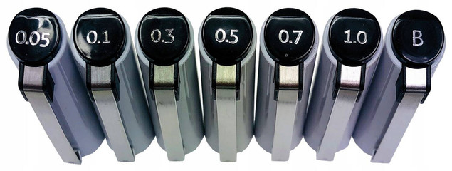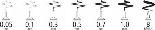 - szerokości końcówki piszącej: 0,05; 0,1; 0,3; 0,5; 0,7; 1,0 mm; B (idealnie sprawdzi się do rysowania precyzyjnych kształtów)