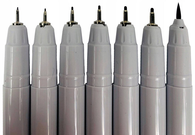 Profesjonalne cienkopisy do szkicowania z siedmioma rozmiarami końcówki. Przypadną do gustu szczególnie artystom, którzy cenią sobie precyzję i wykonanie detali rysunku. Cienkopisy odporne na wodę i blaknięcie. 7 końcówek w rozmiarach:0.05 mm, 0.1 mm, 0.3 mm, 0.5 mm, 0.7 mm, 1.0 mm i B.