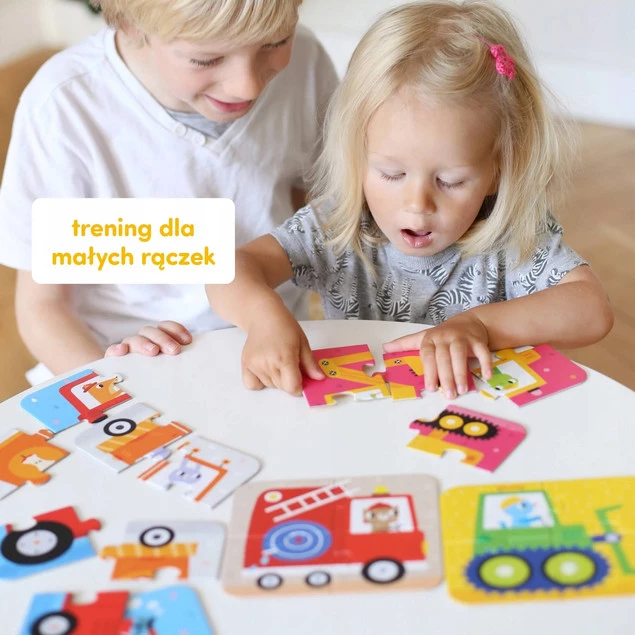 Brum, brum! Kolorowe pojazdy i sympatyczni kierowcy zabierają maluchy do świata coraz trudniejszych puzzli!