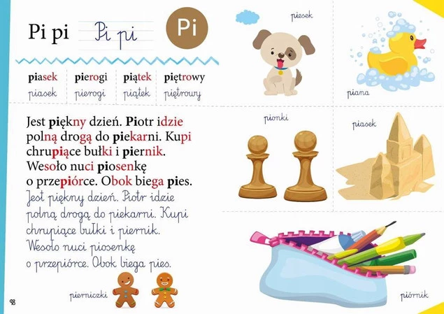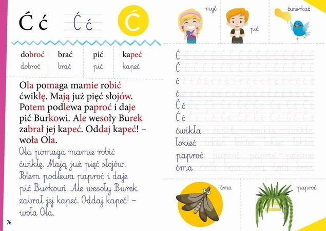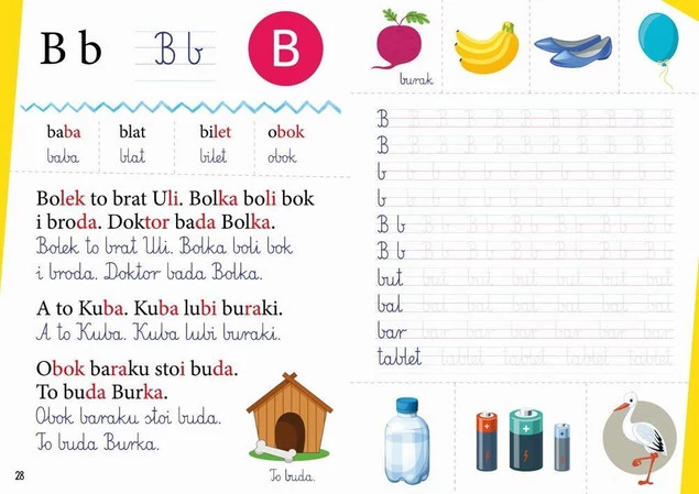 Dodatkowo każdy tekst drukowany został zapisany również literami pisanymi, by pokazać dziecku różnicę w zapisie i oswoić je z pismem zeszytowym. Przy każdej literze zamieściliśmy też liniaturę, w której dziecko może poćwiczyć pisanie danej litery oraz wyrazów ją zawierających. Mój elementarz – nauka czytania, nauka pisania składa się z kilku działów.