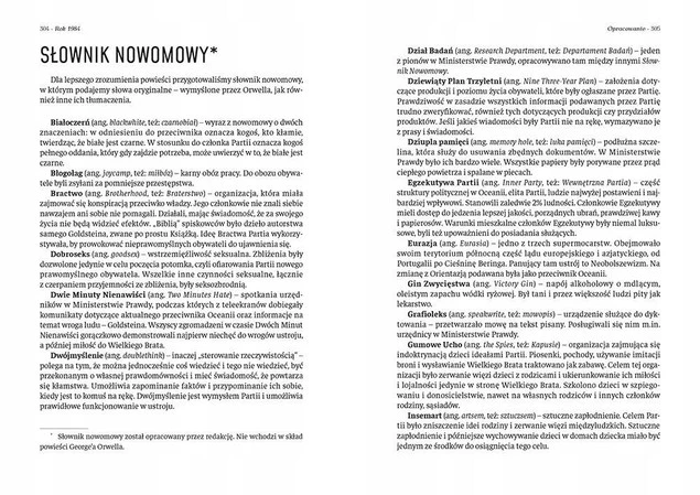 Wydanie Roku 1984 kompletne bez skrótów i cięć w treści. W tym wydaniu znajdziesz odpowiedzi na pytania z podręcznika - „pewniak na teście”, czyli wskazanie zagadnień, które zwykle pojawiają się w pytaniach z danej lektury we wszelkich testach sprawdzających wiedzę, a także w podręcznikach i na klasówkach. Książka zawiera pełen tekst lektury. Na końcu książki zamieszczono opracowanie, w którym znajduje się bardzo szczegółowe streszczenie oraz drugie skrócone, ułatwiające szybkie przygotowanie się przed lekcją. Opracowanie zawiera ponadto plan wydarzeń, wnikliwie wyjaśnioną problematykę oraz szerokie charakterystyki bohaterów.
