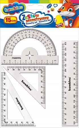 Przybory Geometryczne 15cm 4 Elementy Ekierka Kątomierz Linijka Bambino