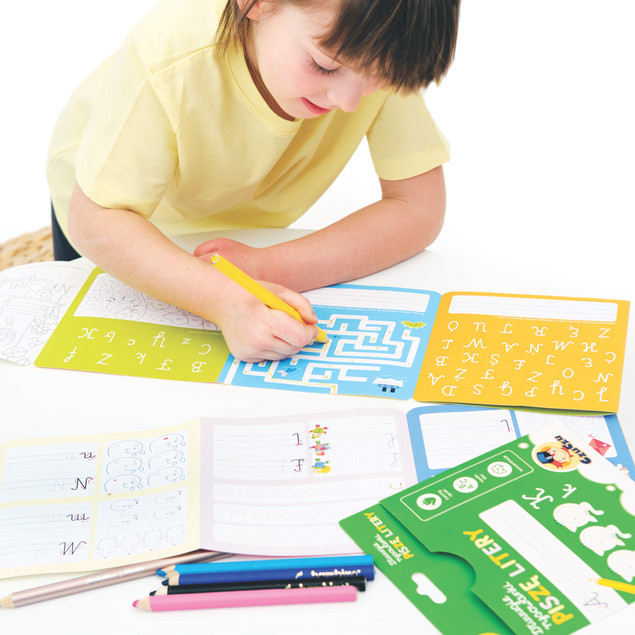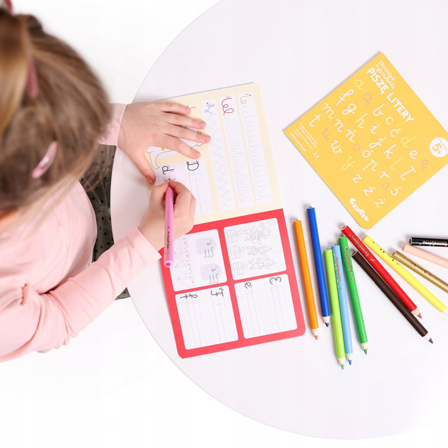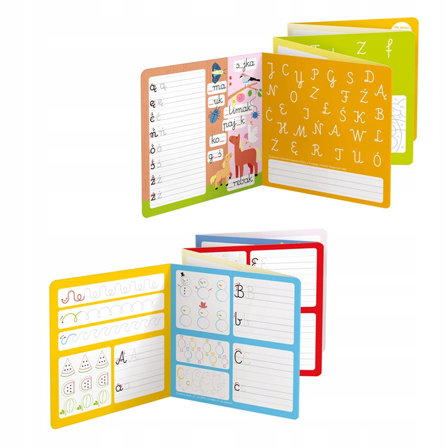 Edukacyjny zestaw zawiera 2 długie książeczki harmonijki, które zachęcają dzieci poznawania liter i podejmowanie prób pisania. Ciekawe zadania i kolorowe ilustracje pokazują, że nauka liter i ćwiczenia doskonalące rękę mogą być fascynująca zabawą. Książeczki przedstawiają litery pisane z polskiego alfabetu.