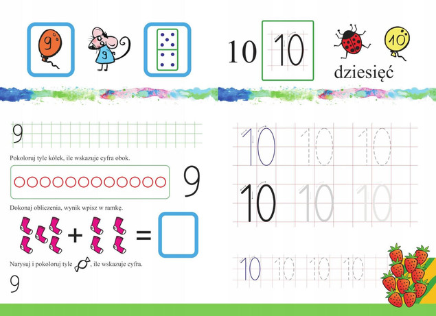 W książce znajdują się ćwiczenia polegające na pisaniu po śladzie, odwzorowaniu kształtów oraz samodzielnym pisaniu i liczeniu.