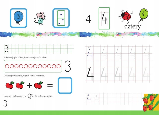 W książce znajdują się ćwiczenia polegające na pisaniu po śladzie, odwzorowaniu kształtów oraz samodzielnym pisaniu i liczeniu.