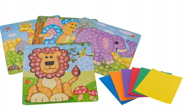 Mięciutkie, piankowe kafelki i kolorowe obrazki ze zwierzątkami zachęca co pracy każdego malucha. Dziecko podczas wyklejania mozaiki poznaje kolory i kształty, rozwija swoją motorykę małą oraz uczy się cierpliwości. Zabawa wyklejankami rozwija zdolności manualne dziecka. Kreatywna zabawa na długie godziny, bez bałaganu. Zestaw do nauki wyklejania to świetne ćwiczenie precyzji i koncentracji, gdyż dziecko skupia uwagę na zadaniu.