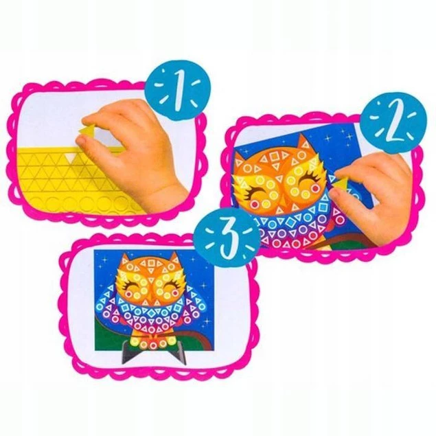 Kreatywna wyklejanka to pomysł na super zabawę. W zestawie są 4 obrazki, na które w odpowiednie miejsca należy nakleić piankowe elementy w kształcie kółka, kwadratu czy trójkąta, aby stworzyć piękne dzieło.