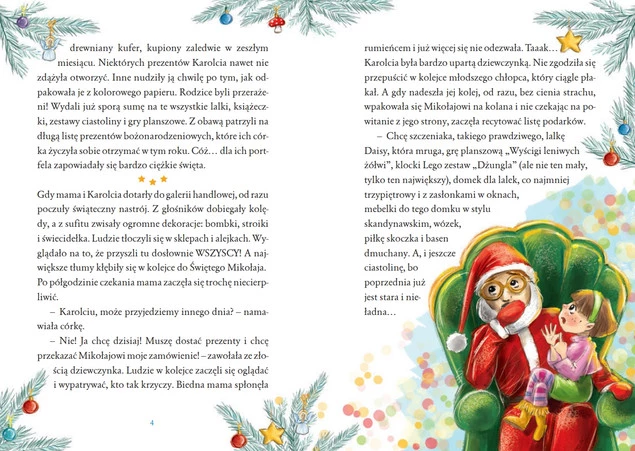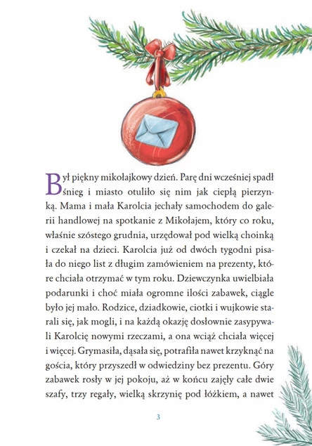 No właśnie: dostawać, ale czy potrafiła się nimi cieszyć? A co z wdzięcznością za podarunki? Oto dziewczynka spotyka tajemniczego starszego pana z siwą brodą. Wygląda jak Mikołaj, ale przecież przed chwilą zamówiła już prezenty u Mikołaja w galerii handlowej! Dziwne, że ten staruszek tyle o niej wie... Czy Karolcia posłucha jego rad? I kto w tym roku zostanie obdarowany na święta?