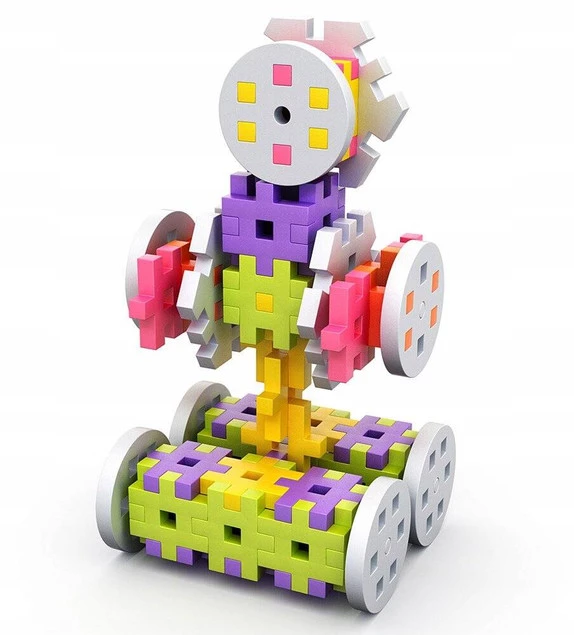 Klocki konstrukcyjne Wafle Constructor Basic 400 el. marki Meli to doskonały zestaw edukacyjny, który wspiera rozwój kreatywności i intelektu dzieci od 3 lat. Zestaw zawiera 370 podstawowych, płaskich klocków oraz 30 specjalnych elementów takich jak koła, osie i sześciokąty, które umożliwiają budowanie różnorodnych konstrukcji – od pojazdów po roboty czy śmigłowce. Zabawa klockami uczy liczenia, dodawania, odejmowania, rozpoznawania kolorów oraz rozwija zdolności motoryczne i koordynację ręka-oko.