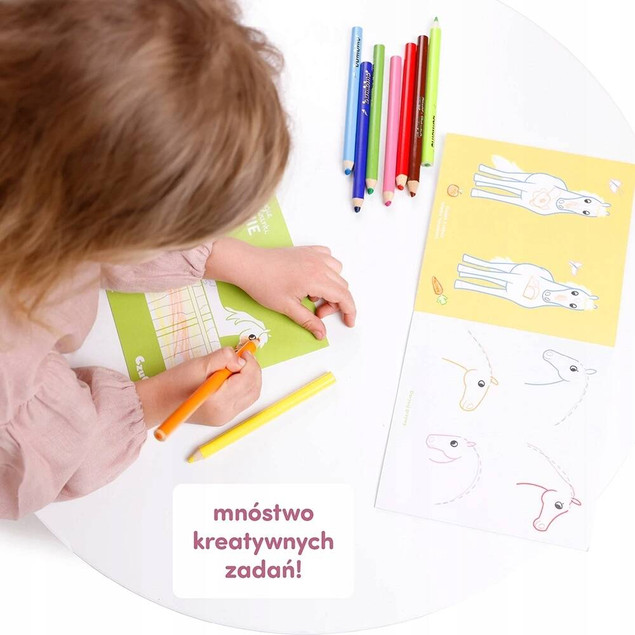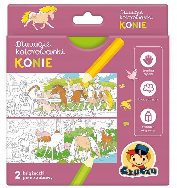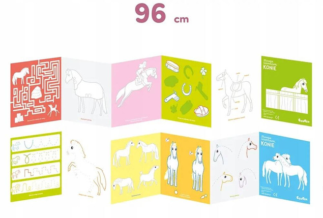 Zestaw zawiera 2 długie książeczki harmonijki pełne kreatywnych zabaw. To prawdziwa gratka dla wszystkich, którzy lubią konie i życie w siodle! Z jednej strony każdej książeczki znajduje się długa kolorowanka, a z drugiej twórcze zadania, dostosowanych do wieku przedszkolaków. Kolorowanki i łamigłówki inspirują do wesołych i rozwijających zabaw.