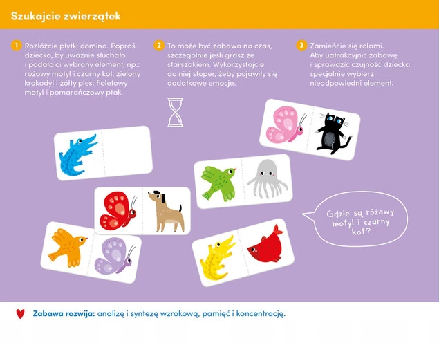 To jednocześnie układanka i gra, która rośnie razem z dziećmi. Elementy można łączyć na różne sposoby: kolorami, zwierzętami, kolorami i zwierzątkami lub tradycyjnymi oczkami. Zagrajcie razem w klasyczne domino lub łączcie kolorowe, duże elementy, poznając przy tym kolory i trenując spostrzegawczość i logiczne myślenie. Dostosujcie poziom trudności zabawy do rozwijających się umiejętności dzieci. Mnóstwo pomysłów na edukacyjne zabawy znajdziecie w poradniku dołączonym do zestawu.
