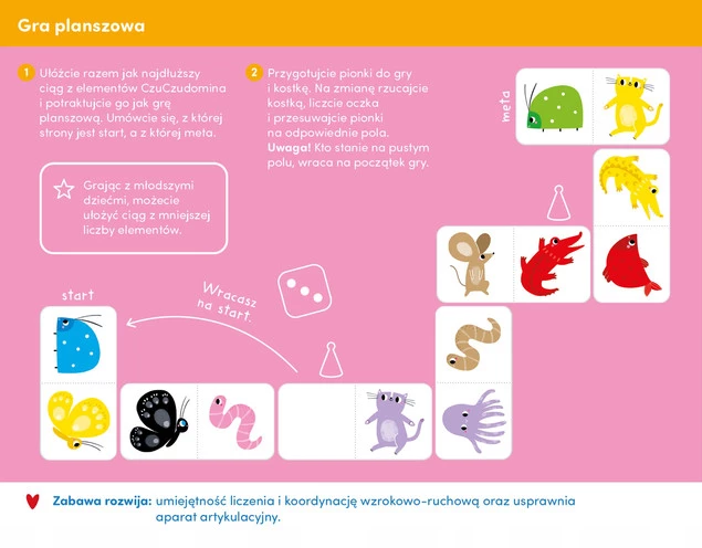 CzuCzu domino rośnie razem z dziećmi, dlatego polecamy je graczom w wieku od dwóch dwóch lat, a górnej granicy nie ma. Dostosujcie poziom trudności do rozwijających się umiejętności dziecka. Najmłodsi gracze mogą zacząć zabawę od dopasowywania dwóch elementów i układania coraz dłuższych ciągów. Nazywajcie zwierzątka i kolory na obrazkach. Starszaki mogą dopasowywać elementy z taką samą liczbą oczek. Zabawa to przyjemny sposób na rozwijanie różnych umiejętności, poznawanie nowych słów oraz spędzanie czasu razem. To też świetna okazja do nauki radzenia sobie z emocjami pojawiającymi się podczas gry.