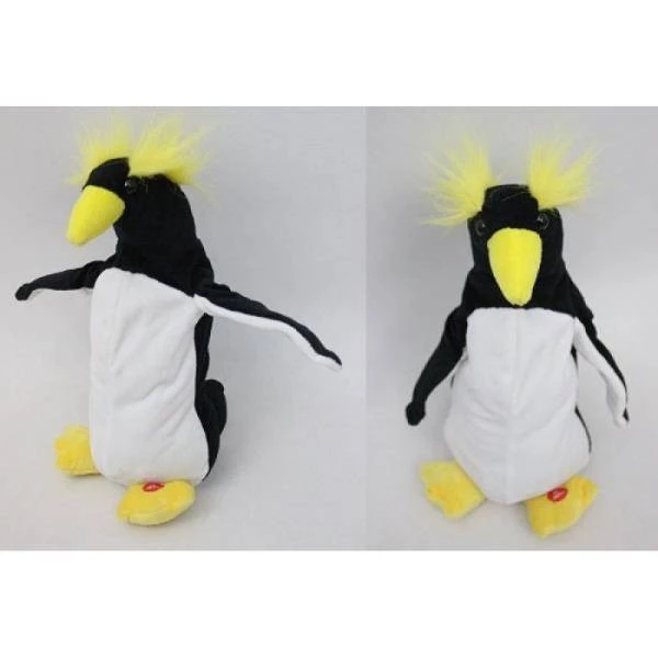 Pluszowy pingwin na baterie. Maskotka która tańczy i śpiewa. Czarno-biały pingwin z żółtymi stopami i włosami na głowie. Baterie: 3 x 1,5V AA (załaczone). Wymiary zabawki: 32 x 20 x 16 cm. Wiek: 3+.
