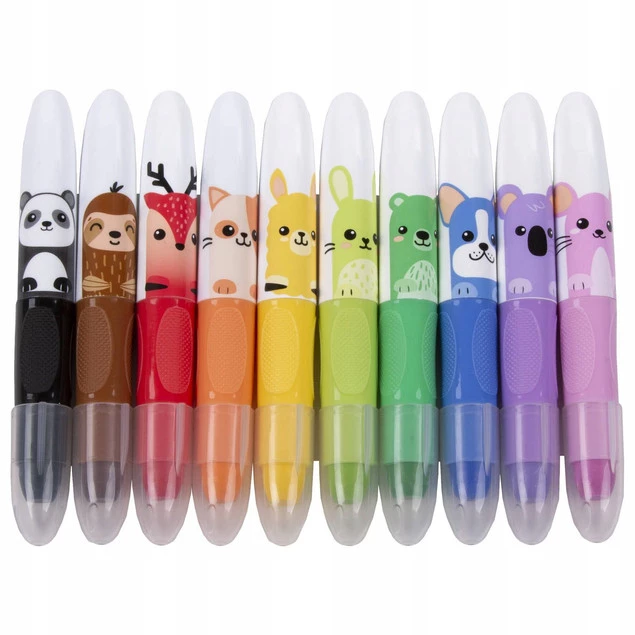 Kredki żelowe w 10 wyjątkowych odcieniach. Rysowanie nimi to czysta przyjemność, ruchy stają się takie płynne, a efekt gładki. Dodatkowym atutem są przemiłe zwierzaki, na każdej kredce inny wzór. Są bardzo wydajne, miękkie i doskonale kryją. Świetnie sprawdzają się w kolorowaniu dużych powierzchni. Nie wymagają temperowania – ich wkład wysuwa się za pomocą pokrętła. Idealne dla dzieci, które dopiero rozpoczynają przygodę z plastyką. Uwaga! Kolorowanie nimi jest naprawdę wciągające… !