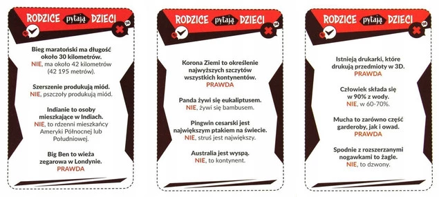 Ile dni ma rok przestępny? Czy tofu to rodzaj ziemi? Z czego powstaje diament? Którą planetą od Słońca jest Ziemia? Wiele ciekawych pytań sprawi, że będziecie świetnie bawić się odpowiadając co jest prawdą, a co fałszem. To kultowa dynamiczna rozgrywka, a przy okazji wiele ciekawych informacji. Dzieci rywalizują z rodzicami. W grze znajdziecie pytania przygotowane specjalnie dla dzieci i dla rodziców.