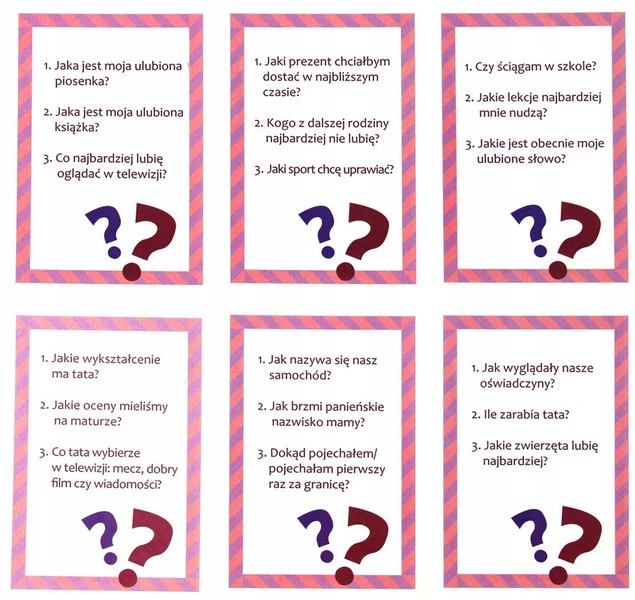 Jak dobrze rodzice znają dzieci, a jak dzieci znająrodziców? Dynamiczna gra rodzinna, w której dzieci i rodzice odpowiadają nawiele zabawnych pytań dotyczących ich codziennego życia. W grze znajdują siępytania opracowane specjalnie dla dzieci i dla rodziców. A czego Wy dowiecie sięo sobie? :)