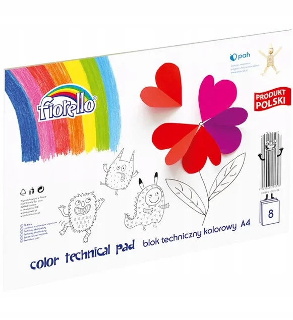 Blok techniczny Fiorello o formacie A4 zawiera 8 kolorowych kartek, idealnych do różnorodnych projektów artystycznych i plastycznych. Dzięki różnorodnym barwom, blok doskonale sprawdzi się w kreatywnych zastosowaniach, takich jak wycinanki, collages czy rysunki. Wysokiej jakości papier zapewnia trwałość i intensywność kolorów, co umożliwia wykorzystanie różnych mediów, w tym kredek, flamastrów i farb. Lekka konstrukcja bloków ułatwia przenoszenie, co czyni je doskonałym wyborem zarówno do szkoły, jak i do zabawy w domu. Idealny dla dzieci oraz wszystkich miłośników sztuki!