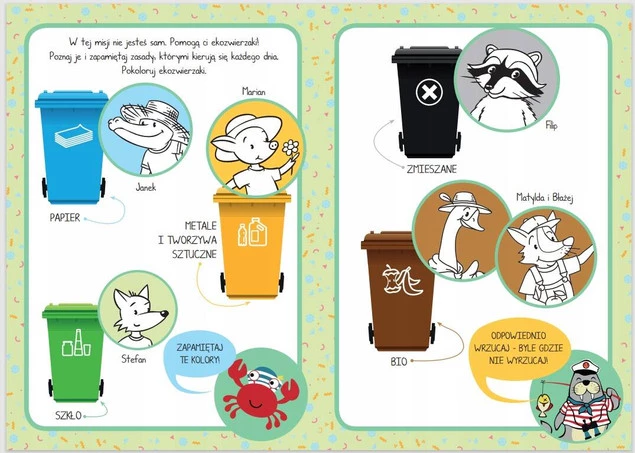 Niezbędnik każdego ekobohatera! W walce o dobro planety nie jesteś sam – u twojego boku stają ekozwierzaki. Zebrane przez nie ekozasady i ekozabawy uwrażliwiają na delikatność przyrody, przestrzegają przed nieodwracalnością zmian i pokazują, jak dbać o środowisko w myśl zasady: odpowiednio wrzucaj – byle gdzie nie wyrzucaj!