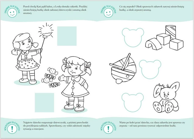 Dodatkowym atutem książek są wskazówki dla rodziców, które opisują cel ćwiczenia i wyjaśniają, jak należy pomóc dziecku przy danym zadaniu.
