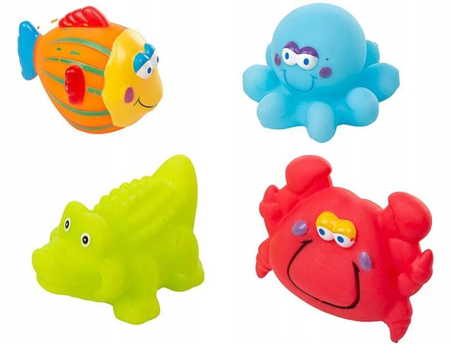 Zestaw 4 kolorowych zabawek do kąpieli. Idealne do zabawy w kąpieli. Wyjątkowe i unikalne wzornictwo. Żywa kolorystyka przyciąga uwagę maluchów. Dziecko poprzez zabawę poznaje otaczający go świat.