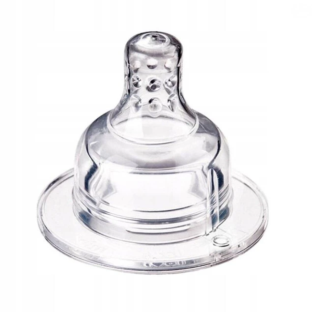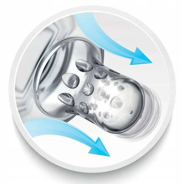Miękka, wydłużająca się końcówka mobilizuje mięśnie jamy ustnej do aktywnej, wytężonej pracy podczas karmienia. Twarda, szeroka, profilowana podstawa stanowi stabilne oparcie dla warg. Smoczek posiada system antykolkowy.