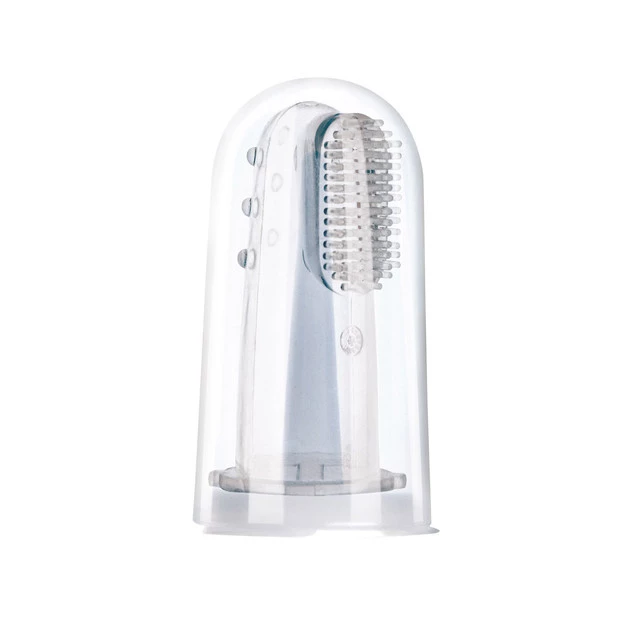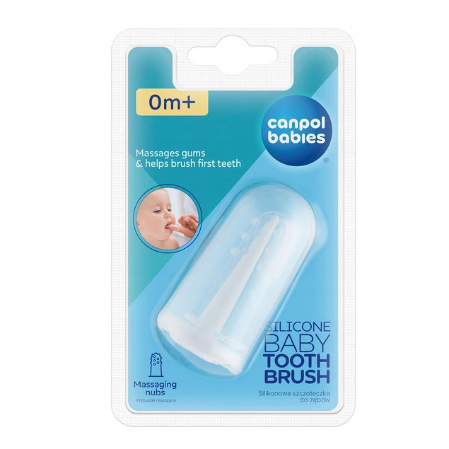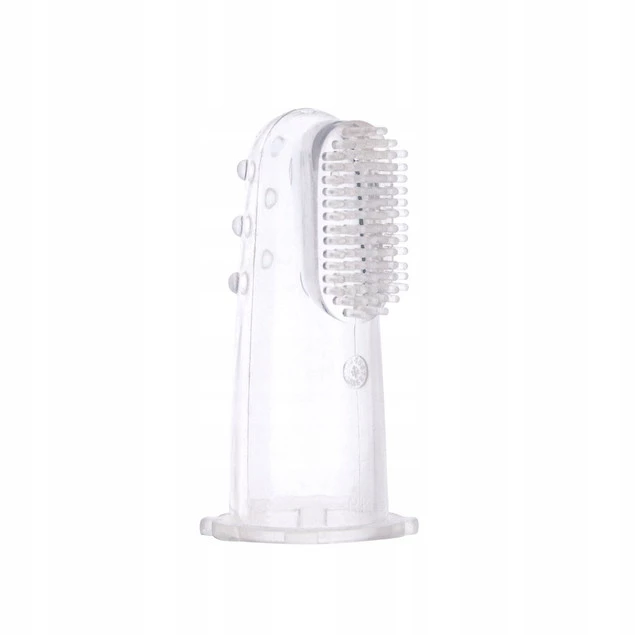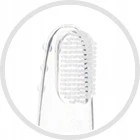 Miękka szczoteczka z wypustkami nakładana na palec idealnie nadaje się do mycia pierwszych ząbków. Wykonana została z silikonu wolnego od BPA. Można ją stosować u dzieci, które jeszcze nie mają ząbków do masażu i codziennej higieny dziąsełek. Umożliwia delikatne czyszczenie bez ryzyka ich uszkodzenia. Konstrukcja szczoteczki umożliwia dotarcie w trudno dostępne miejsca. W zestawie higieniczny pojemnik do przechowywania.