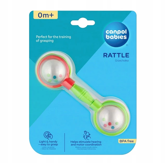 Zabawka przeznaczona dla dzieci w wieku 0m+. Dostępna jest w kilku wariantach kolorystycznych. W opakowaniu 1 sztuka. Grzechotki nie można dezynfekować, gotować i myć w zmywarce. Zabawkę utrzymuj w czystości. Przed pierwszym użyciem sparz grzechotkę wrzątkiem. Nie gotuj jej i nie dezynfekuj. Dla zachowania higieny myj regularnie grzechotkę w delikatnym płynie, dokładnie wypłucz i pozostaw do wyschnięcia. Przed podaniem zabawki dziecku sprawdź jej jakość. Jeśli jest zużyta, zniszczona lub pogryziona – wymień na nową. Uwaga! Nie zostawiaj dziecka podczas zabawy bez opieki osoby dorosłej.