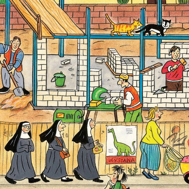 Każda strona tej książki to barwna, pełna szczegółów i postaci ilustracja przedstawiająca fragment miasta. Na kolejnych rozkładówkach odnajdujemy tych samych bohaterów w różnych miejscach i momentach dnia. Wypatrywanie ich i układanie opowieści o ich przygodach to wciągająca zabawa na długie godziny.