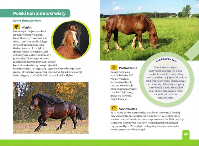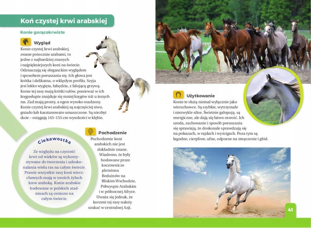 Jaki to koń? Atlas dla dzieci przedstawia ponad 60 najbardziej znanych ras koni gorącokrwistych, zimnokrwistych, a także kuców. Oprócz informacji o pochodzeniu danej rasy, jej cechach i użytkowaniu znajdziesz tu również ciekawostki oraz mnóstwo zdjęć. Dzięki atlasowi rozpoznasz m.in. konia czystej krwi arabskiej, konia fryzyjskiego czy kuca baszkirskiego.