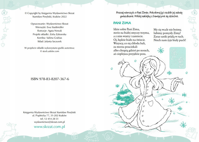 Śnieżne kolorowanki, zgadywanki, ozdabianki i rysowanki. Nastrojowe wierszyki znanej krakowskiej poetki Ewy Stadtmüller. Naklejki dodające uciech.