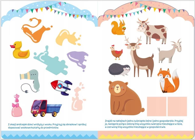 Baw się: znajduj i wklejaj naklejki, odszukuj ukryte obrazki, łącz elementy, pokonuj labirynty, wskazuj kształty i wielkości, rysuj po śladzie, koloruj.