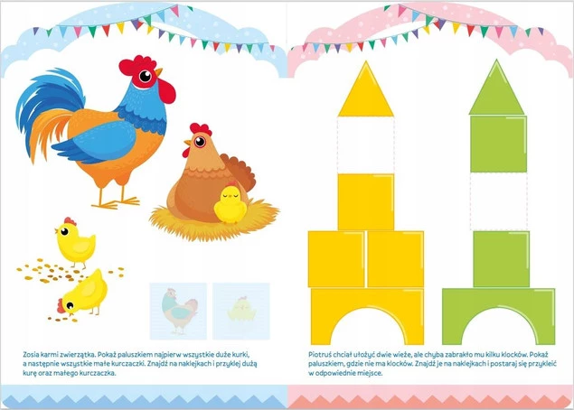 Baw się: znajduj i wklejaj naklejki, odszukuj i łącz elementy, rozpoznawaj kształty, rysuj, koloruj. Ćwicz: spostrzegawczość, umiejętność kojarzenia i orientację w przestrzeni, analizę i syntezę wzrokową, sprawność manualną.