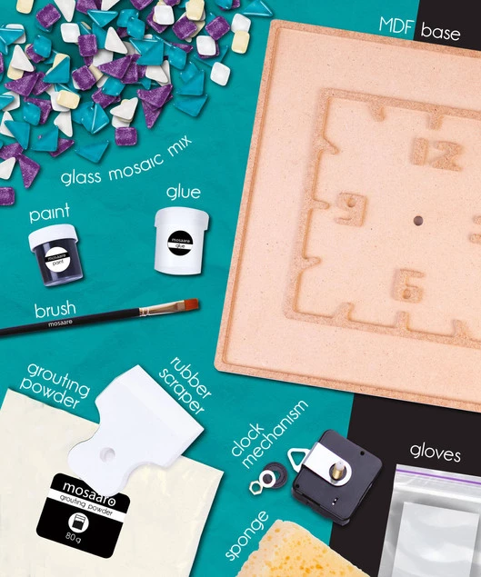 Elementy mozaiki wykonane są ze szkła pochodzącego z recyklingu, a podstawy z płyty MDF. Wszystkie materiały są przyjemne w dotyku, przyjazne dla użytkownika i bezpieczne w obróbce. Każdy zestaw zawiera wszystko, czego potrzebujesz do stworzenia projektu oraz szczegółowe, ilustrowane instrukcje krok po kroku.