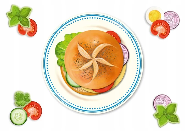 Dziecko ma do dyspozycji: bułeczkę, kromkę chleba, plasterki sera i jajka oraz wiele kolorowych plasterków warzyw. Może bawić się w przygotowywanie śniadanka dla siebie i dla innych domowników.
