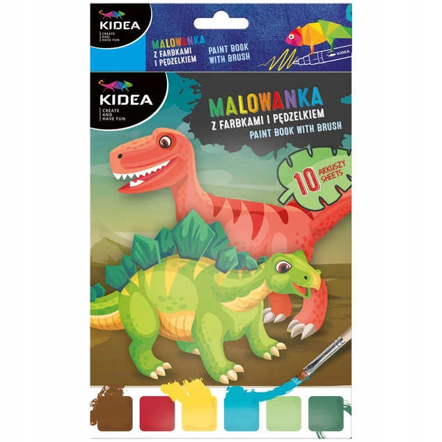 Wewnątrz znajdziesz aż 10 arkuszy do pomalowania z różnymi gatunkami dinozaurów!