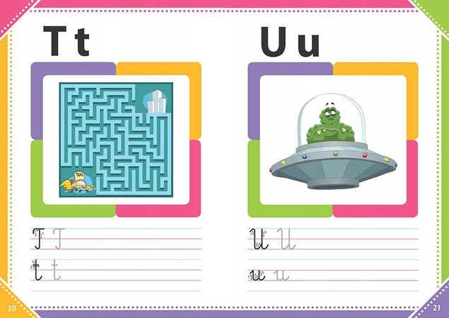 Przy każdej literce zamieszczono wyraźny wzór wraz ze strzałkami pokazującymi, jak napisać ją prawidłowo. Niektórym literkom towarzyszą barwne rysunki przedstawiające zwierzę, osobę lub rzecz na daną literkę, przy innych rysunek zamieniono na kolorowankę lub ciekawy labirynt.