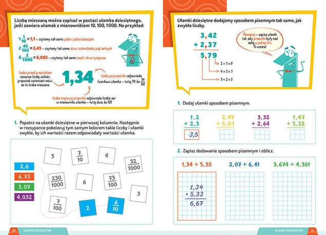 ✔Publikacja pozwala zrozumieć, czym są ułamki, oraz uczy posługiwania się nimi w prosty i intuicyjny sposób dzięki bardzo dokładnym i dostosowanym do możliwości małego ucznia wyjaśnieniom teoretycznym oraz licznym przykładom graficznym. Liczne starannie przemyślane ćwiczenia pozwolą opanować umiejętność dodawania i odejmowania ułamków oraz skracania i rozszerzania ich. Dodatkowo książeczka wprowadza podstawy wiedzy o ułamkach dziesiętnych. Bardzo kolorowa i estetyczna oprawa graficzna zachęca do rozwiązywania zadań.