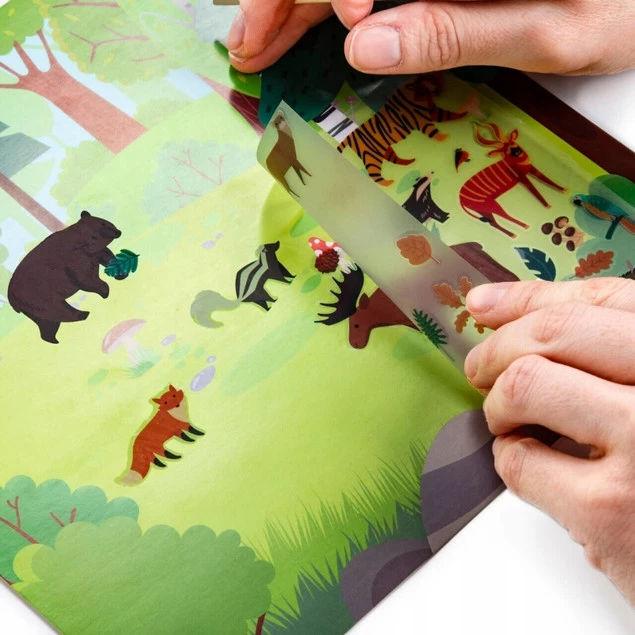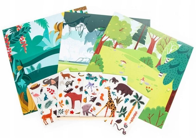 Zawiera 3 tła do wyklejania, drewnianą szpatułkę oraz 4 arkusze z motywem zwierząt.