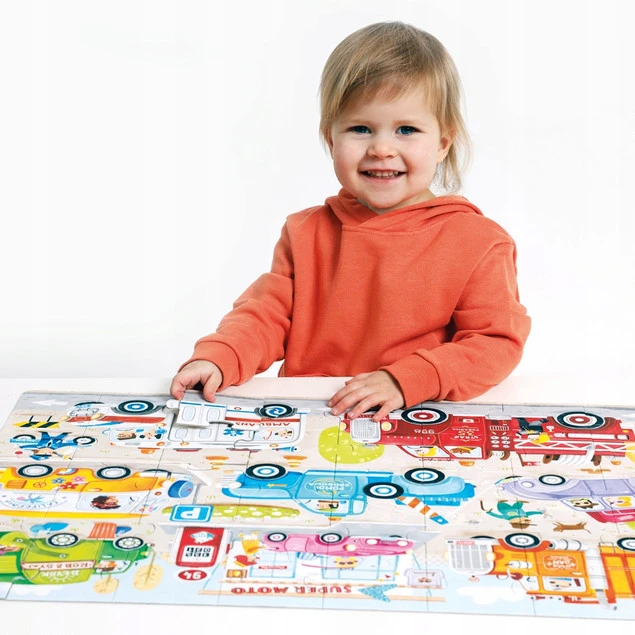Duża edukacyjna układanka składa się z 40 elementów i przedstawia ulubione pojazdy dzieciaków: różnego rodzaju auta, śmieciarkę, wóz strażacki, karetkę czy pomoc drogową. Układanie puzzli to wszechstronnie rozwijająca zabawa: pozwala doskonalić małą motorykę, spostrzegawczość i cierpliwość. Dodatkowo jest świetnym wstępem do rozmów, poszerzania wiedzy i podstawą dalszych kreatywnych zabaw.